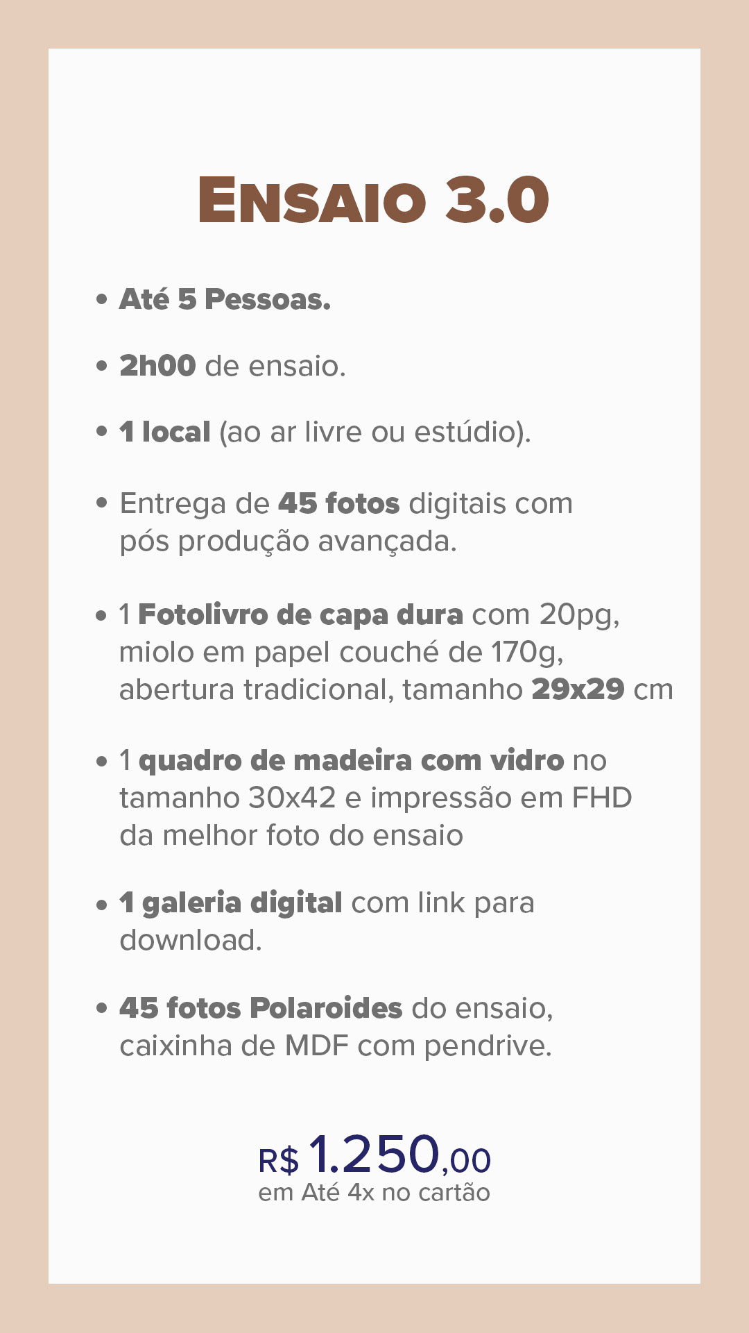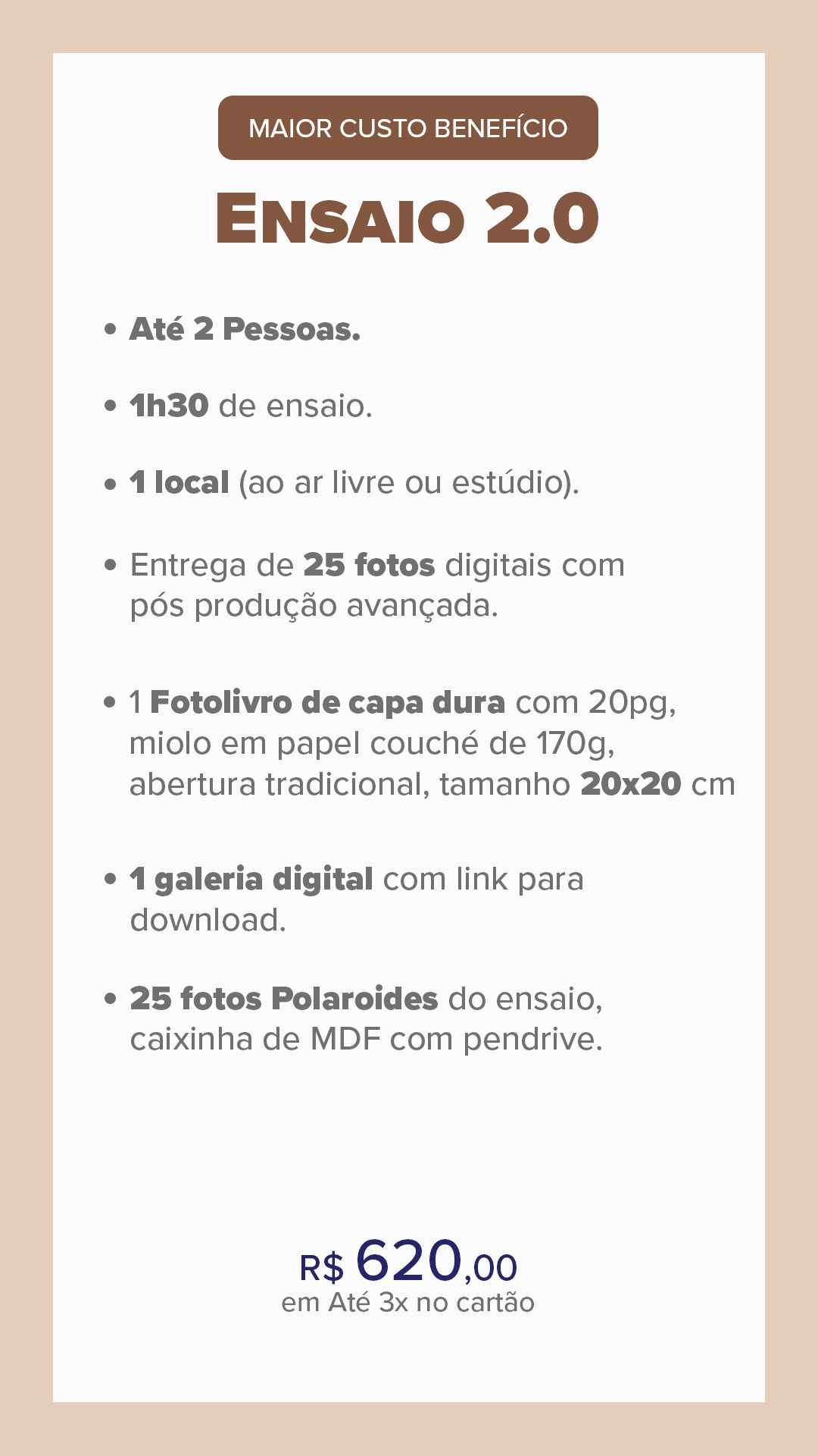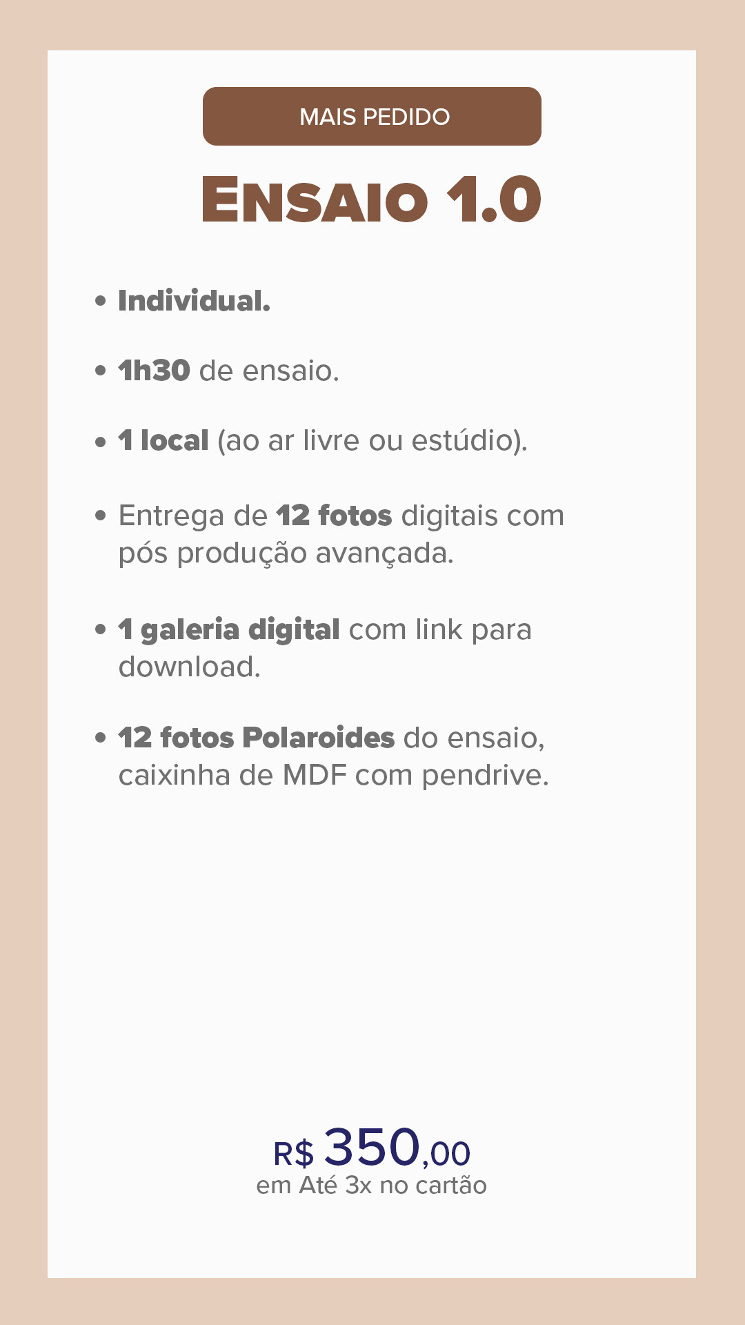 *Se desejar mais tempo de ensaio, cada hora extra custa R$ 200 e inclui 10 fotos adicionais.