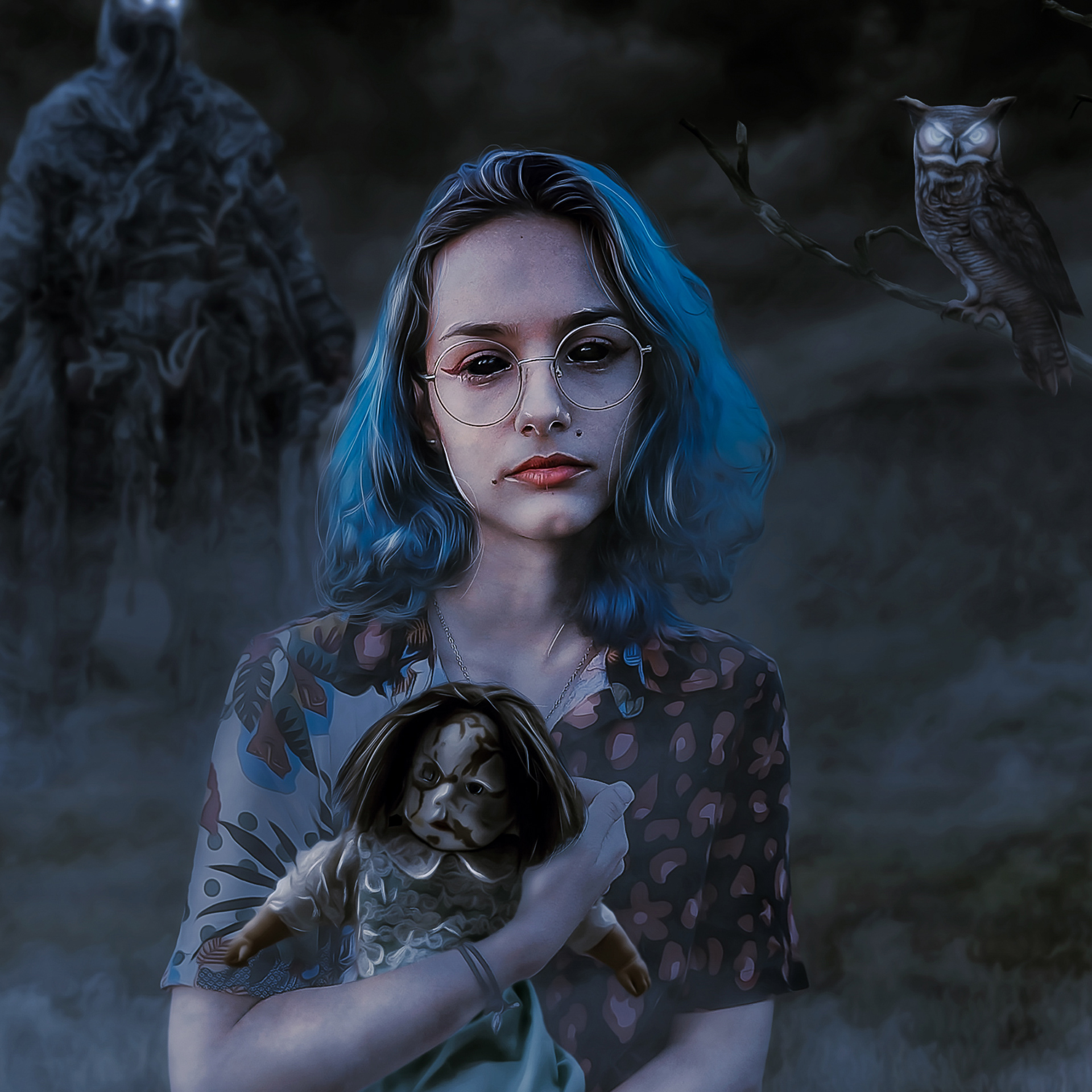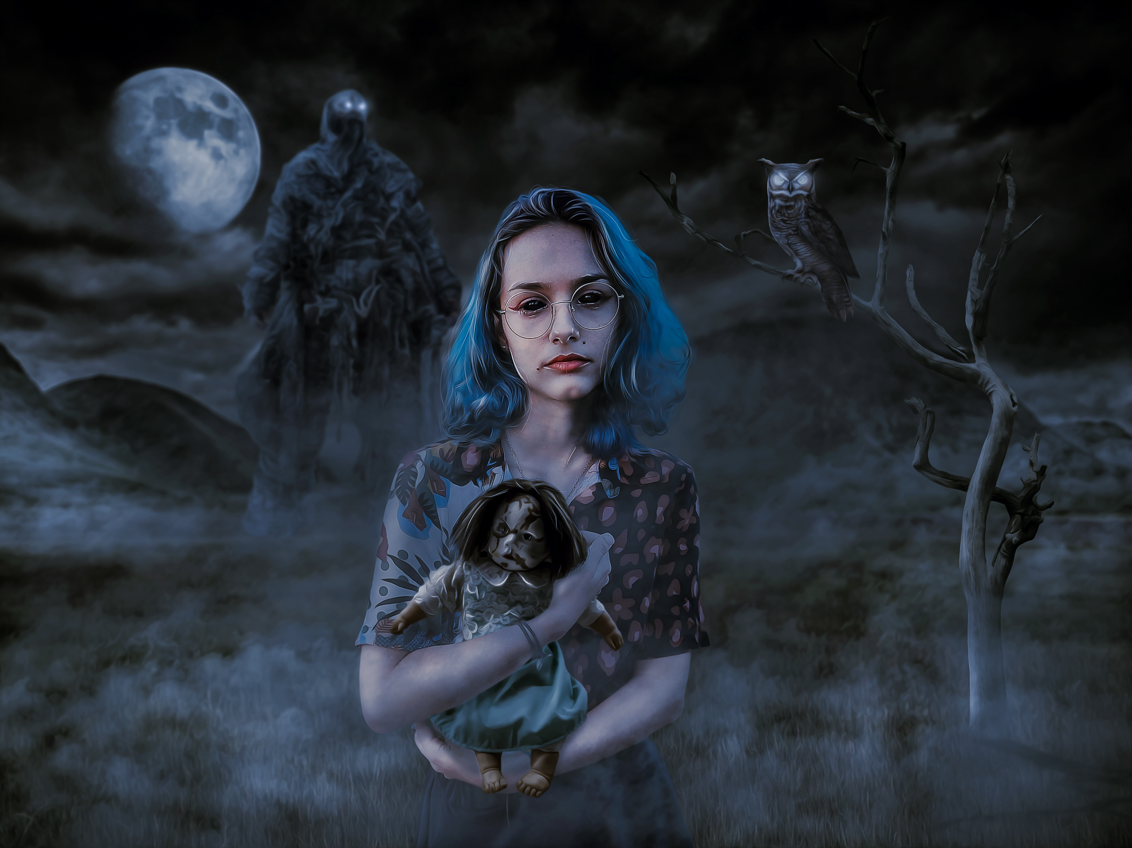 Nesta obra de arte, somos transportados para um mundo pós-apocalíptico. A cena se desenrola por volta da meia-noite, onde uma pequena mulher, recentemente possuída por uma entidade maligna, vagueia sem destino pelos campos sombrios de algum lugar desolado. A atmosfera é carregada de mistério e tensão, enquanto a figura solitária parece perdida em um universo distópico e desolado. A representação visual desse cenário pós-apocalíptico convida o espectador a refletir sobre temas como a natureza da humanidade, a luta entre o bem e o mal, e o impacto devastador das forças sobrenaturais em um mundo em ruínas.